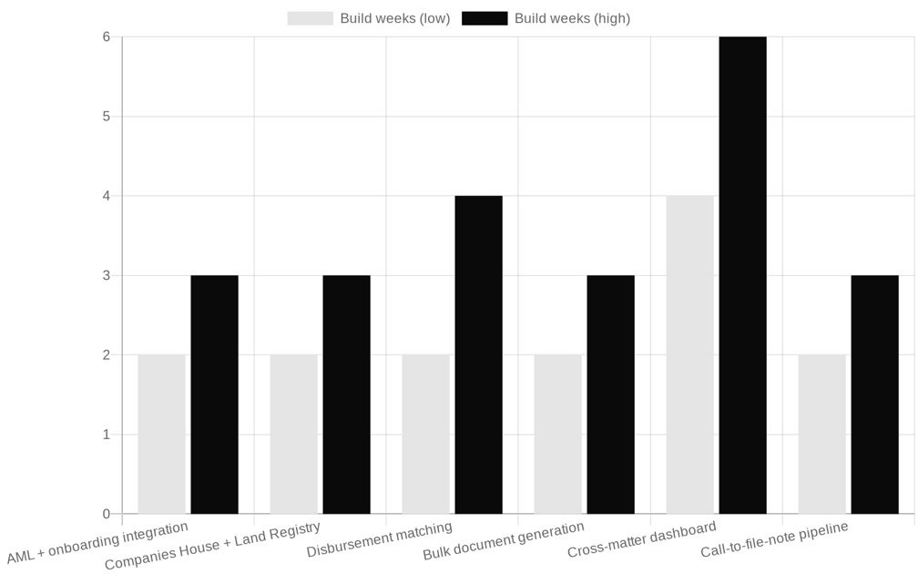Companies House and Land Registry pulls on matter intake. Webhook on matter create where the matter type is commercial or property, lookup the counterparty company, pull directors and charges from Companies House, pull title register from Land Registry, attach as file notes or documents on the matter. Build time: 2-3 weeks. The Actionstep write-back is straightforward; the external API handling is where the time goes.