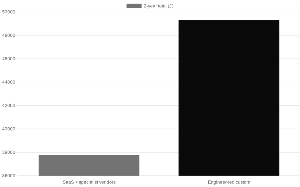 2-year total: £47,800-£50,800. Costs £10,000-£13,000 more over 2 years than the SaaS-and-vendor path. In return, the workflows are integrated with the back-office and platforms (not just running adjacent to them), and the firm owns the code.