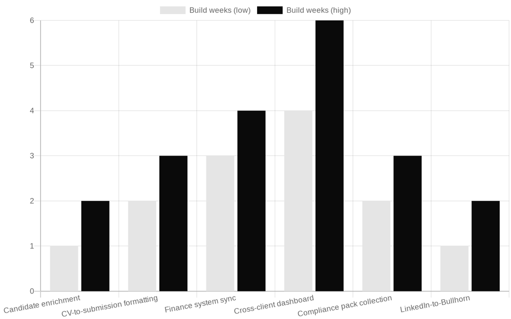 None of these are Bullhorn Automation jobs. None of them are Zapier jobs at agency scale (Zapier hits its task limits fast). All of them are 1-6 weeks of custom code that runs on your own infrastructure for the next several years.